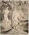 In Blake's mythology, Albion's fall from a divine androgyny to a sexual nature divides him into the Four Zoas, their spectres (representative of hypocritical morality), and their emanations (female halves). In the Paradise Lost illustrations, Adam is analogous to the fallen Albion, Satan to Adam's Spectre and Eve to Adam's emanation.[3]
