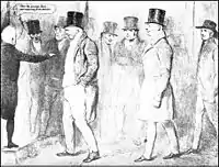 At this time the writings of William Cobbett suddenly became of great authority; they were read on nearly every cottage hearth in the manufacturing districts of South Lancashire, in those of Leicester, Derby, and Nottingham; also in many of the Scottish manufacturing towns. Their influence was speedily visible. He directed his readers to the true cause of their sufferings—misgovernment; and to its proper corrective—parliamentary reform.[63][64][65]