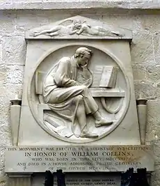 St Andrews, the church where Collins was buried, was converted to an arts centre in the 1970s, but the poet is now commemorated by a window on the south side drawing on the Flaxman memorial and showing him at his reading.[29] There is also a blue plaque placed on the Halifax building in East Street on the site of his birthplace.[30]