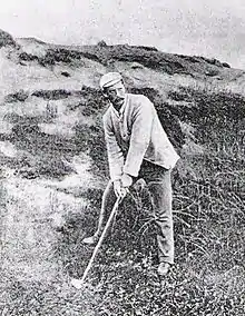 The 1887 Open Championship was played in almost incessant rain and a cross wind. Campbell was the warm favourite amongst the local crowd and was followed by the majority of the spectators.[6] Despite all his success his most famous golfing moment—which turned out to be a disastrous failure—would come here, at Prestwick, where Campbell was an assistant professional. Late in the final round he was in good shape to win but heeled his tee shot at the 16th hole and found a deep bunker (later dubbed Campbell's grave). The gallery tried to convince him to play backward but unfortunately he ignored their advice and took eight on the hole. Willie Park, Jr. would go on to win by a single stroke.[7]