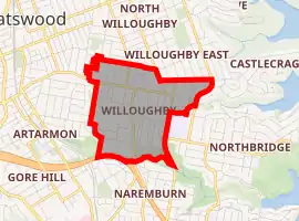 - Australian Bureau of Statistics (27 June 2017). "Willoughby (State Suburb)". 2016 Census QuickStats. Retrieved 9 March 2018.