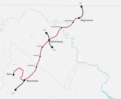From the B&O's old central station in downtown Winchester, the Winchester and Western Railroad ventures south and then follows Abram's Creek west out of the city. From there, the W&W travels northwest, eventually parallelling the Northwestern Turnpike (U.S. Route 50) where it goes through Hoop Petticoat Gap along Gap Run at Chambersville, today known as Round Hill. Still heading in a northwest direction with the Northwestern Turnpike, the W&W departs from the turnpike and follows Hogue Creek north, southeast of Hayfield. The W&W continues north until it intersects with the North Frederick Pike (U.S. Route 522) and enters the community of Gainesboro. The line then curves southwest into the Back Creek valley. At the southern edge of Bowling Green Ridge, the W&W crosses the Northwestern Turnpike one last time and follows Back Creek south to Gore. From Gore, the line heads south along Mine Spring Run where it currently ends at the sand mine.