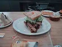 Rascal House had the quintessential elements of a Jewish delicatessen, namely a large selection of deli soups and sandwiches (typically listed on an oversized laminated menu), a bowl of cold pickles and a basket of assorted rolls for every table. While Rascal House's featured dish was their classic stacked corned beef sandwich, they also served Jewish home cooking, such as matzah brei, a breakfast meal consisting of strips of matzoh cooked like scrambled eggs.