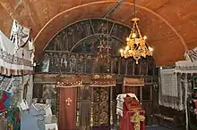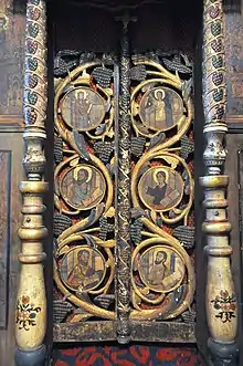 While there is no particular style to Toader’s work, the 18th century icons on the royal doors are in Brâncovenesc style. Fourteen small icons sit atop the doors; one is signed by Toader, indicating that all are by him. The Apostles and Jesus as bishop are by another artist; above them are the Crucifixion, with Mary, John the Apostle and angels. Twelve prophets, with Mary in the center, are painted on the arch leading into the altar. The sides of the royal doors feature the Annunciation of Mary and the Four Evangelists. The church holds a deteriorated Byzantine style icon of Mary; its appearance suggests that parishioners brought it from Bukovina.[9]