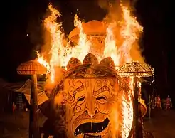 The final evening of the Woodford festival culminates in a spectacular New Year's Day closing ceremony, The Fire Event.[2] Over 20,000 festival goers seated on the grassed Amphitheater hillside witness a spectacle of dance, music, theatricality and fire - with the burning of a large structure heralding the New Year.[2] The Fire Event was developed by Neil Cameron at the former Maleny festival and continued at Woodford, Paul Lawler worked with Cameron and took over as creative director of the event from 2003 - 2011, followed by Joey Ruigrok Van De Werven from 2012 - 2014, and Alex Podger from 2014.[2] The January 2000 Fire Event was featured in the global live TV broadcast heralding the new millennium.
