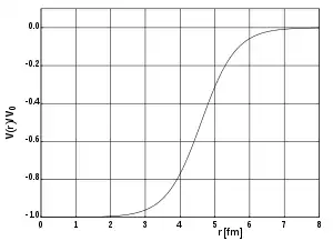 where V0 (having dimension of energy) represents the potential well depth, a is a length representing the "surface thickness" of the nucleus, and is the nuclear radius where r0 = 1.25 fm and A is the mass number.