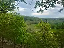 The Woodstock Tower, built in 1935 by the Civilian Conservation Corps, is located on a 2000 ft mountain that overlooks the town.[45] The tower is a popular sightseeing attraction, providing panoramic views of the valleys on either side and of the seven bends of the North Fork of the Shenandoah River. The road to the tower crumbled due to erosion in March 2019 and is closed for repairs. $350,000 worth of repairs are being made by Virginia Department of Transportation. The target date for the road re-opening was November 2019.[46] The road re-opened again in November 2019.