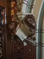The library, under the Banqueting hall, is extremely large, "to encompass all the interests of its polymath owner".[52] Construction began in 1873, and concluded just after Burges's death.[41] The chimneypiece has carved figures referring to the purpose of the room and to the Marquess, a noted linguist. Four represent the ancient Greek, Assyrian, Hebrew and Egyptian alphabets while the fifth figure is believed to represent Bute himself, clad as a Celtic monk.[52] Desks, constructed from walnut, incorporate early radiators, decorated with heraldic motifs.[53] Carvings in the library, as elsewhere, illustrate Burges's sense of humour, as well as his alertness to contemporary controversy. Four monkeys cavorting around the Tree of Knowledge, one stealing an apple, two wrestling over the Book of Truth, and one poring over the book in puzzlement, are his comment on Charles Darwin's On the Origin of Species.[54]