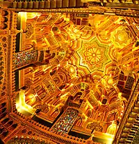 The Herbert Tower is of brown rubble and is Holland's work up to the third storey. Above it, Burges added two further storeys and the battlemented roof.[17] The tower contains two of Burges's "finest miniature interiors", Bute's study and the Arab room.[42] The latter room is one of Burges's masterpieces, John Newman describing it as "the most exotic in the castle".[39] Its jelly-mould ceiling in a Moorish style is drawn from Burges's studies of Islamic art in Spain and Sicily, and from a book on the architecture of Cairo published in 1877.[39] John Grant, the architect employed at the castle by the fourth Marquess, and author of a history of the building published in 1923, incorrectly stated that "the decoration is based on an actual room in Arabia", as well as repeatedly misspelling Burges's surname.[43] As usual, Burges led on every aspect of the room's design, including the stained glass, the marbled floor and walls, the gilded parrots on the cornice,[39] the cedar wood wall cabinets inlaid with silver and the statuettes of Eastern deities.[44] It was the last room on which he was working when he fell ill in 1881. After his death in April of that year, Bute placed Burges's initials, together with his own, and the date, in the fireplace of the Arab Room as a memorial.[13] The room was completed by Burges's brother-in-law, Richard Popplewell Pullan.[44] The room is almost exactly contemporaneous with the Arab Hall constructed by Frederick, Lord Leighton in his Holland Park house and illustrates the later Victorian obsession with the Orient.[44]