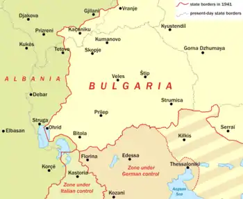 ![]() Map of Vardar Macedonia during World War II. The area was divided between Albania and Bulgaria and the frontier between them run approximately along the line: Struga — Tetovo — Gjilan — Vranje. (3 years, 7 months, 1 week and 5 days) | ||||||||