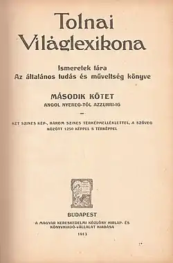 The World lexicon of Tolnai (Hungarian "Tolnai világlexikona"), after a long preparatory work, was first published in 1912, when only 8 volumes were published. The publication of additional volumes that had already been prepared was prevented by the First World War, largely rendering obsolete the contents of the published and still edited volumes of the series.