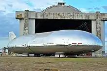 Project Pelican was a US government-funded project to build and test a half-scale prototype of the proposed full-size Aeroscraft, using representative structure and avionics.[12] Having a length of 266 feet (81 m) and design speed of 60 knots (110 km/h; 69 mph), it does not carry a payload.[13] The company received US$60 million from the U.S. Department of Defense to develop the concept,[14] resulting in a prototype named Dragon Dream, which underwent systems tests and some tethered flights in late 2013. The first floating took place on January 3, 2013, at the hangar at the former Marine Corps Air Station in Tustin in which it was constructed, where it hovered indoors at a height of 12 feet (3.7 m) for several minutes.[15] The Pentagon has declared that the tests of the Dragon Dream were a "success", with the craft meeting its demonstration objectives.[16] The airship was rolled out of its hangar on July 4, 2013[17][18] and performed its first flight on September 11. It was subsequently damaged when part of the roof of the hangar collapsed on it on 7 October 2013.[19] The company sued the Navy for $65 million in 2015 for the collapse.[20]