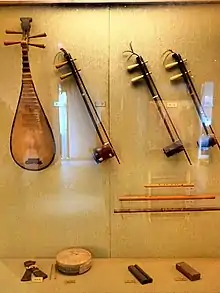 Wuxi opera has a variation of upper and lower tunes.[27] First of all, Wuxi opera has a Huang Tune, the oldest tune of Wuxi opera. Huang Tune originated from long narrative folk songs in the southern region of the Yangtze River Delta, and as such, absorbed folk tune styles such as “Suzhou Tanci”. Huang Tune includes old Huang Tune, Huang Tune Adagio, Anti-Bow Pantaloon’s Tune, Allegro, Long Three-Tune and other different types of tunes. Huang Tune is a kind of melody with narrative feelings, rich melodies and cheerful rhythms.[28] Instrumental accompaniment is mainly performed on the Erhu, while the Pipa, Sanxian and Dulcimer are often played as subsidiary instruments; Xiao, Flute and Zhonghu are also included in the music.[29]
