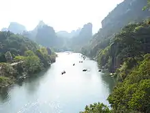 The Nine-bend River (Jiuqu Xi), about 60 kilometers in length, meanders in a deep gorge among these hills. In most places, it is a slow, shallow stream navigable only by small craft like rowboats and canoes. However, the river narrows at one point to just a few metres but a depth of 80 metres (260 ft).[5]