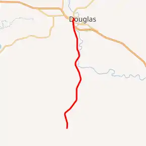 Wyoming Highway 94 begins its southern end south of Douglas, 10 miles (16 km) north of Esterbrook. Converse County Route 5 takes over the roadway to Esterbrook. WYO 94 heads north towards Douglas, and parallels the North Platte River for much of its length.[2] Nearing the city, WYO 94 briefly parallels Interstate 25 and U.S. Routes 20/26/87 as Highway 94 meets the eastern terminus of Wyoming Highway 91 (Cold Springs Road).[2] WYO 94 passes under the interstate as it enters the city limits, and shortly thereafter reaches its northern end at an intersection with I-25 BUS/US 20 BUS/US 26 BUS/US 87 BUS (W. Yellowstone Highway), and the southern terminus of Wyoming Highway 59[2] at approximately 16.6 miles.[3]