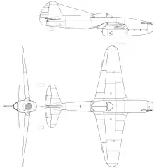 On 9 April 1945, the Council of People's Commissars ordered the Yakovlev OKB to develop a single-seat jet fighter to be equipped with a single German Jumo 004 engine. To save time, Yakovlev based the new design (known as the Yak-3-Jumo or Yak-Jumo) on the latest version of his successful Yakovlev Yak-3 piston-engined fighter. The piston engine was removed and the jet engine was mounted underneath the forward fuselage so that its exhaust exited underneath the middle of the fuselage. To protect the fuselage, a steel heatshield was added to its bottom. The deeper forward part of the fuselage caused the configuration of the aircraft to resemble a "pod-and-boom".[4] Very few changes were made to the metal fuselage other than at the aircraft's nose. This was recontoured to accommodate the armament of two 23-millimeter (0.91 in) Nudelman-Suranov NS-23 autocannon, an additional fuel tank above the engine and the engine itself. No changes were made to the wings other than the elimination of the air intakes for the oil cooler and the bending of the front wing spar into an inverted U-shape to clear the engine. The vertical stabilizer was slightly enlarged, but the tailplane was unmodified. The conventional landing gear was also unmodified other than the tailwheel which now used several steel leaf springs as shock absorbers. The Yak-Jumo carried a total of 590 kilograms (1,300 lb) of fuel.[5]