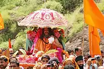 'Yatra' can also describe a procession, or any festival which figures a procession, such as Rath Yatra, where chariots are pulled in parade down the streets of Puri in Orissa. In modern times the word can be used to denote marches or demonstrations, for political, environmental or societal causes.[7][8][9]