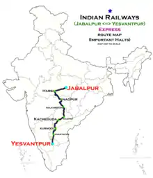 The train runs between Jabalpur Junction on Saturday, the main railway station of Important military hub of central Indian state, Madhya Pradesh and Yeshwantpur railway station, the sub urban railway station of Bangalore, the capital city of Karnataka.