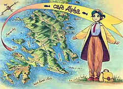 Alpha Hatsuseno is an android ("robot person") who runs an out-of-the-way coffee shop, Café Alpha, on the lonely coast of the Miura Peninsula of Japan, while her human "owner" is on a trip of indefinite length.[6] Though she spends much of her time alone, Alpha is cheerful, gregarious, and—unlike the slowly declining humans—immortal.[5]