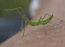 Zelus luridus, also known as the Pale Green Assassin Bug, is a species of assassin bug native to North America. It is the most common Zelus species in the eastern United States.[1] The size ranges from twelve and a half to eighteen millimeters long.[2] On average, adult females are sixteen millimeters long, while males are fourteen millimeters long. Though the base color is pale green, markings on the back can range from dark brown or red to bright yellow. Nymphs are generally more solid green, wingless, and with narrower bodies than adults.[3] The most reliable feature to distinguish this species from others is the pair of spines on the rear corners of the pronotum. These spines are long on the lighter colored individuals and shorter on ones that are darker. It can also be distinguished by dark bands on the distal ends of the femurs, but these can often be too light to be easily seen.[1] The egg masses, which are laid from late June to August, are conical in shape with a flat top. They are laid on leaves in groups of twenty to fifty and held together with a sticky, brownish material.[3] Their bite is extremely painful.