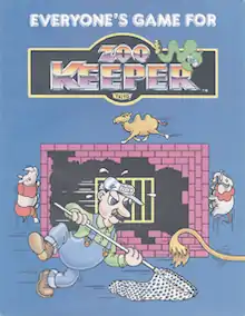 Zoo Keeper is an arcade game created by Taito America and released in 1982. The player controls Zeke, a zookeeper, attempting to rescue his girlfriend Zelda from a zoo where the animals have escaped from their cages. The majority of the game takes place on a screen where the player builds a wall to keep animals in the zoo—jumping them to avoid contact. Platforming segments are interspersed every few levels. The game was available as a conversion kit for Taito's Qix.[2]