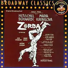 Zorba is a musical with a book by Joseph Stein, lyrics by Fred Ebb, and music by John Kander. Adapted from the 1946 novel Zorba the Greek by Nikos Kazantzakis and the subsequent 1964 film of the same name, it focuses on the friendship that evolves between Zorba and Nikos, a young American who has inherited an abandoned mine on Crete, and their romantic relationships with a local widow and a French woman, respectively.