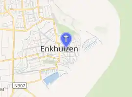 In 1422 the citizens of Enkhuizen received permission from John III, Duke of Bavaria, to tear down the old church of Oostdorp, a village outside the Westfriese Omringdijk (the dyke that protects the area) that had flooded. The new church was dedicated to Pancras of Rome, and building commenced in 1422 or 1423 in a patch of reed. It was reported that the building site had to be raised considerably, and that the walls were as high as the foundation walls were deep.[1] It was mostly finished by 1458; the upper part of the 75-meter tall tower was finished in 1524, but by 1595 the tower was leaning six or seven feet and had to be set straight.[1] Church and tower still dominate the cityscape.[2] The tower is owned by the city of Enkhuizen and was restored and renovated in 1992.