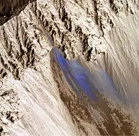 The debris from a recent landslide was first spotted on the south-east wall of the crater by the Mars Global Surveyor Mars Orbiter Camera (MOC) in 2003,[4] and was subsequently imaged at higher resolution by the Mars Reconnaissance Orbiter High Resolution Imaging Science Experiment (HiRISE) in December 2006.[5]